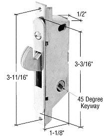 CRL 1/2" Wide Stainless Steel Round End Face Plate Mortise Lock with 3-11/16" Screw Holes for Adams Rite Doors - 45 Degree Keyway. This CRL Mortise Lock has a 1/2 inch (12.7 millimeter) wide stainless steel housing with a round end face plate. The hook projection is adjustable and the keyway is in 45 degree position with the hook fully extended. It fits on Adams Rite doors..