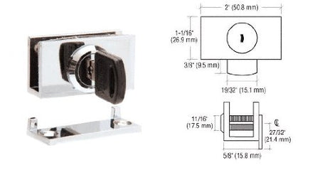 C.R. LAURENCE EH98 CRL Chrome Cam Lock with Stop Plate for 1/4" or 3/8" Glass - Randomly Keyed. CRL Cam Locks are suitable for 1/4" or 3/8" (6 or 9.5 mm) thick glass. Tightening is done by means of two plastic tipped screws. The key can be removed in both the locked and unlocked positions. Lock is supplied with gaskets and template. A matching Stop Plate is included to match the finish of the lock of choice. A cut-out in the glass door is required for installation and a notch template is included in the package..