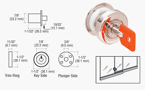 Excellent for any sliding glass door, the CRL Sliding Glass Door Keymatic Plunger Lock is installed directly onto the glass with plunger resting against edge of back sliding door. A 1-1/4" (32 mm) hole must be drilled in the front sliding door to accept the Lock. Will work in doors up to 1/2" (12 mm) thick. A captive operation system allows the key to be removed only in the locked position. Package include the glass cover plate, rubber rings, plastic insert washer and four screws. Additional selections of CRL Keymatic Locks and instructions on keys and combinations are available.