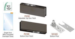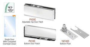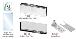 CRL PH3A North American Patch Door Kits come with all the hardware to complete single free-swinging door with fixed transom, except glass and additional supports for the fixed transom. Pivot setback is 2-3/4" (70 mm). Floor closers with tapered spindles (ordered separately) may be used with this kit.