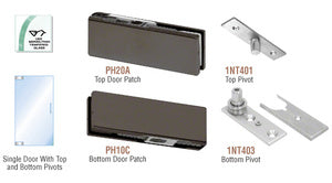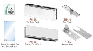 CRL PHA1 North American Patch Door Kits come with all the hardware to complete a single free-swinging door (except the glass). Pivot setback is 3-3/4" (70 mm). Floor closers with tapered spindles (ordered separately) may be used with this kit.
