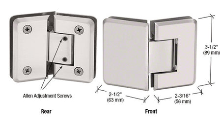 CRL Adjustable Pinnacle Series Hinges offer the flexibility to adjust the angle of the door up to 90 degrees after installation. Simply loosen the Allen set screws, adjust the door to the desired closed position, and tighten the screws for a self-centering effect. The door can swing 90 degrees inward and outward, with the option to adjust the hinge to close 5 degrees inside the shower area for a snug fit against the jamb.