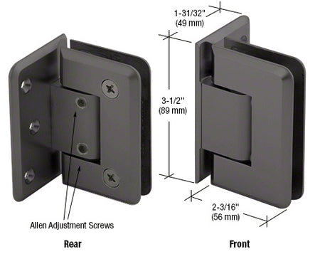 CRL Adjustable Pinnacle Series Hinges take our popular Pinnacle Hinge to a new level. You can adjust the hinge to any angle up to 90 degrees without removing the door. Simply loosen the Allen set screws after the door is hung and turn the door to the desired closed position. Then, tighten the screws to self-center the door. The door can swing 90 degrees inward and outward, but adjusting the angle from the factory set position will reduce this swing. For doors pulling outwards only, you can adjust the hinge to close 5 degrees inside the shower area, ensuring a snug fit against the jamb.