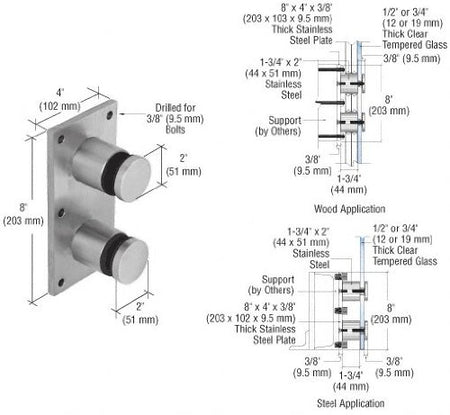 Our CRL Glass Rail Standoff Fittings can be used to mount glass up to 27/32" (21.52 mm) thick. This Alloy 316 stainless steel assembly can be mounted to a wood, concrete, or steel substrate, and features 2" (51 mm) diameter caps on threaded bolts to secure the glass. The 2" (51 mm) diameter Standoffs are fastened to a 3/8" (10 mm) thick stainless steel plate that is pre-drilled for mounting. NOTE: Bracket spacing and maximum glass panel widths vary depending on use and mounting conditions.