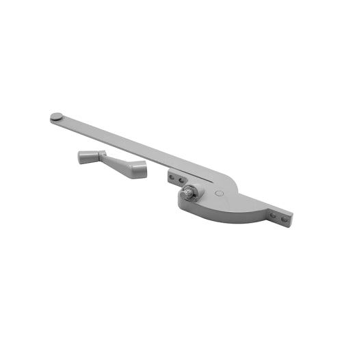 Right handed square body crank handle (viewed from inside looking out) | Mounting holes are 3-7/8 in. and 4-3/4 in. on center | Arm is 9 in. from middle of the guide button to the middle of the crank operator while closed | Heavy Duty diecast zinc construction with a white finish.