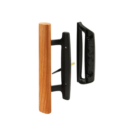 This sliding patio door handle set is constructed of black painted diecast materials and has a wooden handle finished in a light stain. The handle set is non-handed, allowing it to be used on both left and right-handed patio sliding doors using mounting holes are 3-15/16 in. on center.