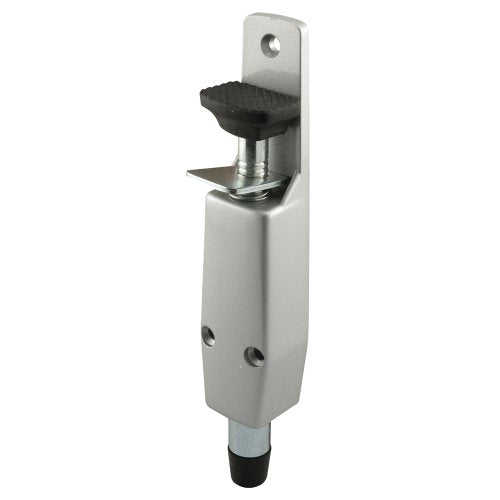 This door holder is constructed from die cast and comes finished in aluminum. It features a spring loaded, plunger style design. It has a large rubber foot treadle for easy, step on operation.