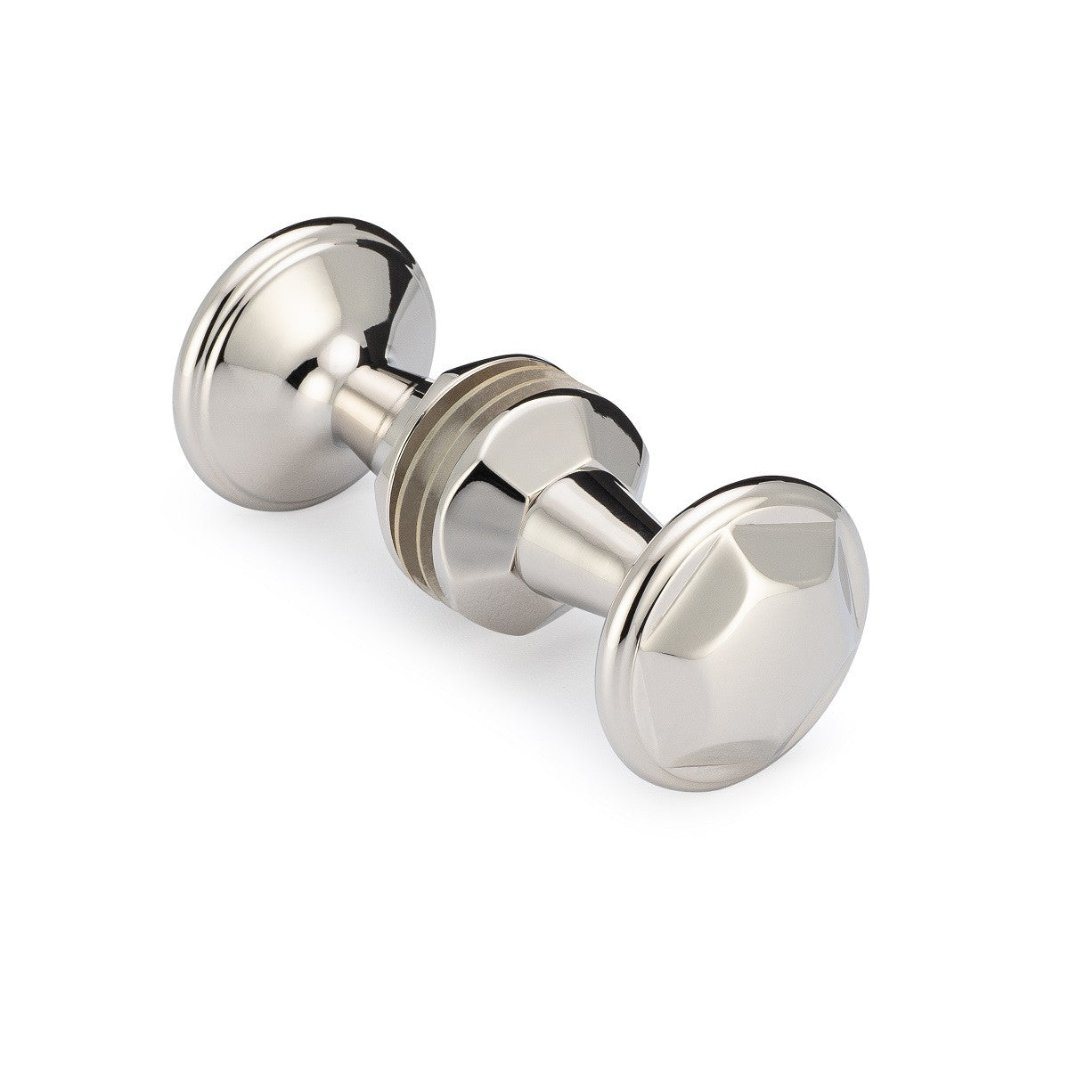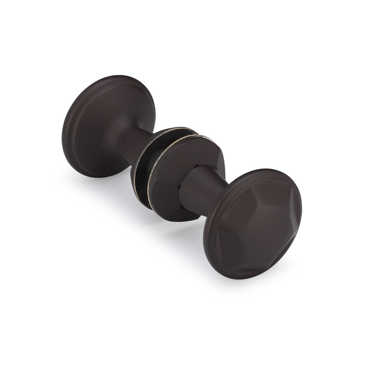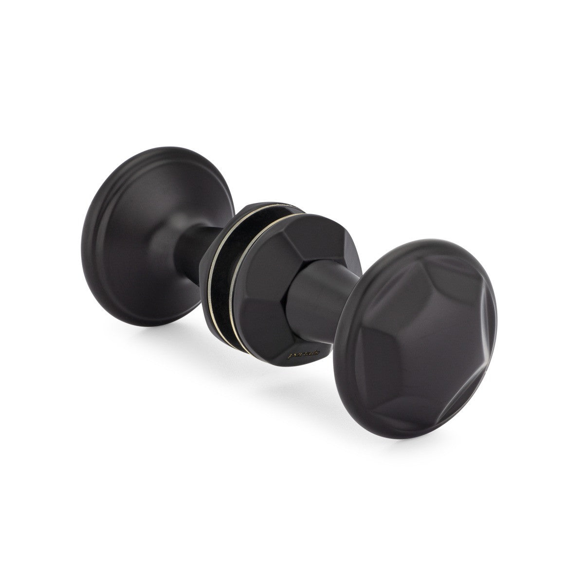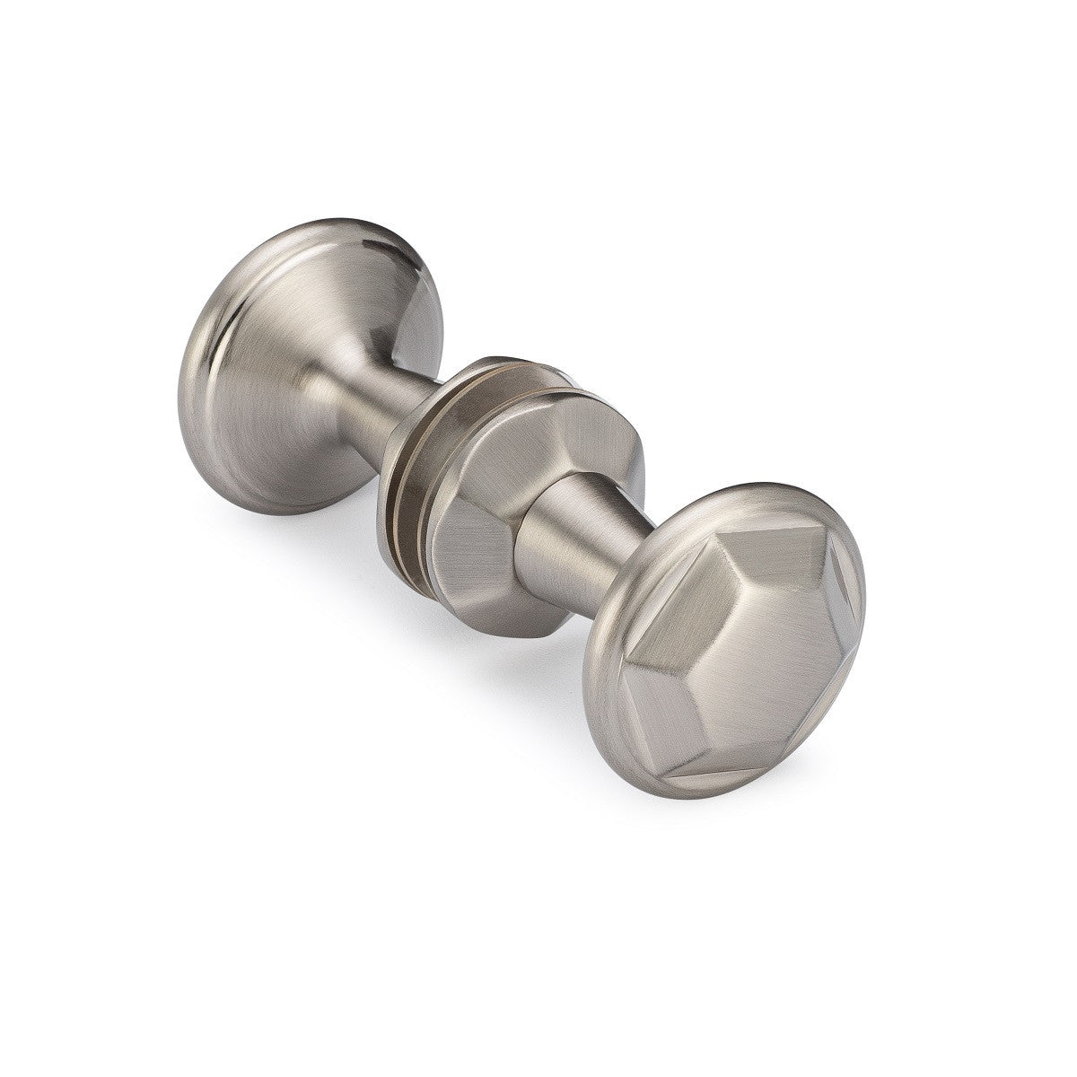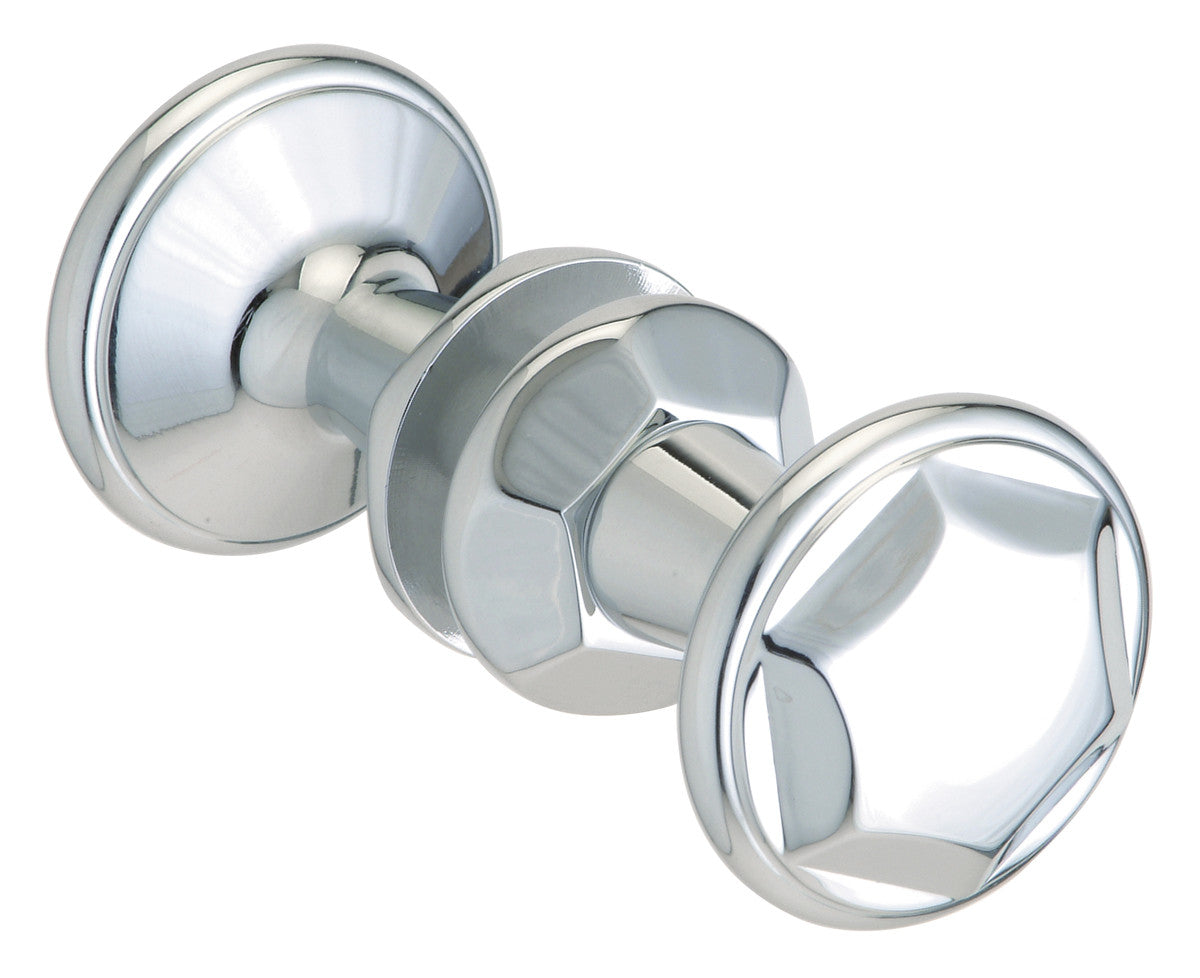 Product design coordinates with other shower and bathroom hardware in the Rondo Suite | Decorative rosettes provide additional design detail and cover any glass defects around the holes | Knobs are designed to be easily grasped and match the scale of heavy glass shower doors | Engineered to provide a lifetime of trouble-free service on 1/4" to 1/2" glass doors.