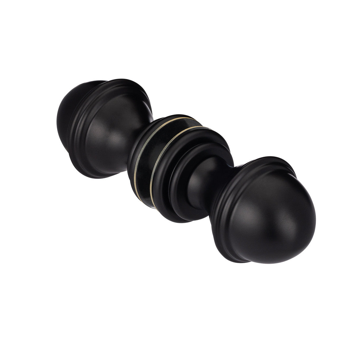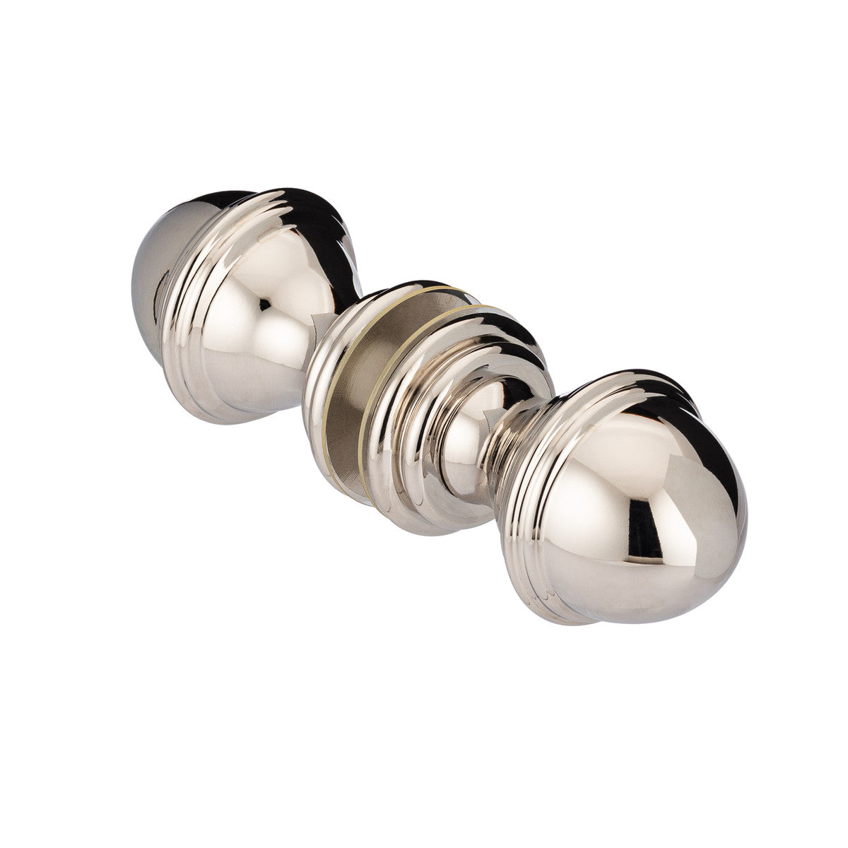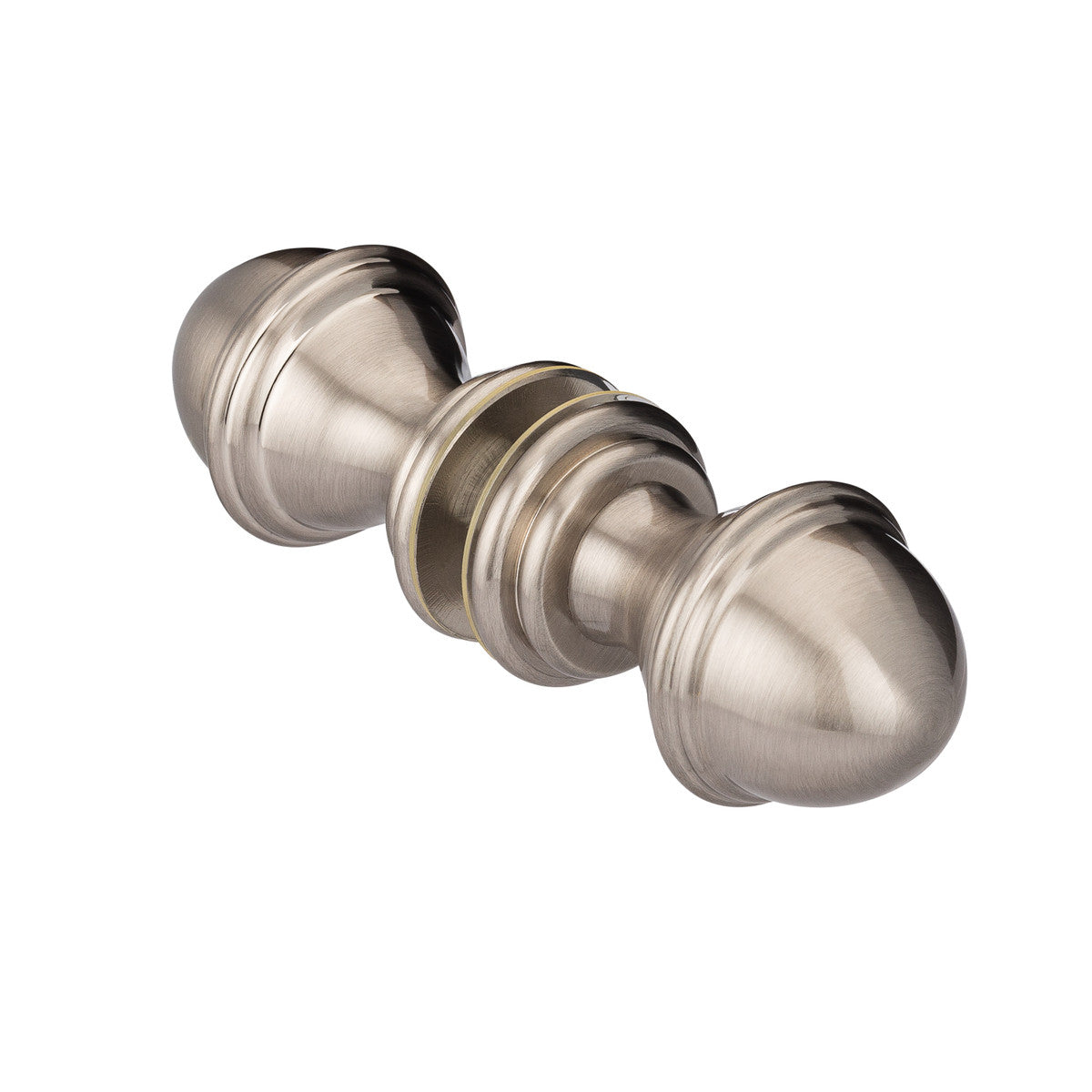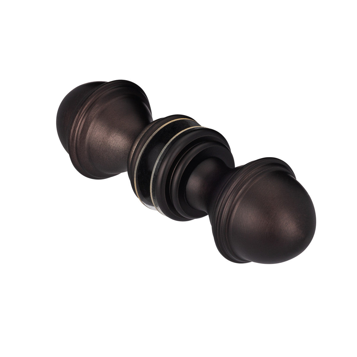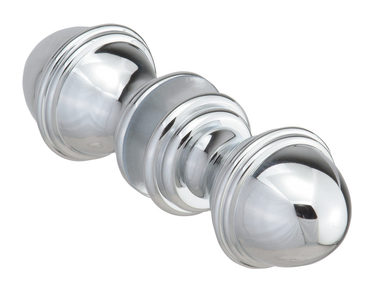 Product design coordinates with other shower and bathroom hardware in the Symphony suite | Decorative rosettes provide additional design detail and cover any glass defects around the hole | Knobs are designed to be easily grasped and match the scale of heavy glass shower doors.